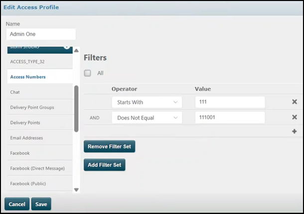 Access profiles can be filtered by user configured parameters. This allows you to use naming and/or extension conventions to edit multiple accesses profiles at once. This is especially useful for organisations with a large number of access profiles.