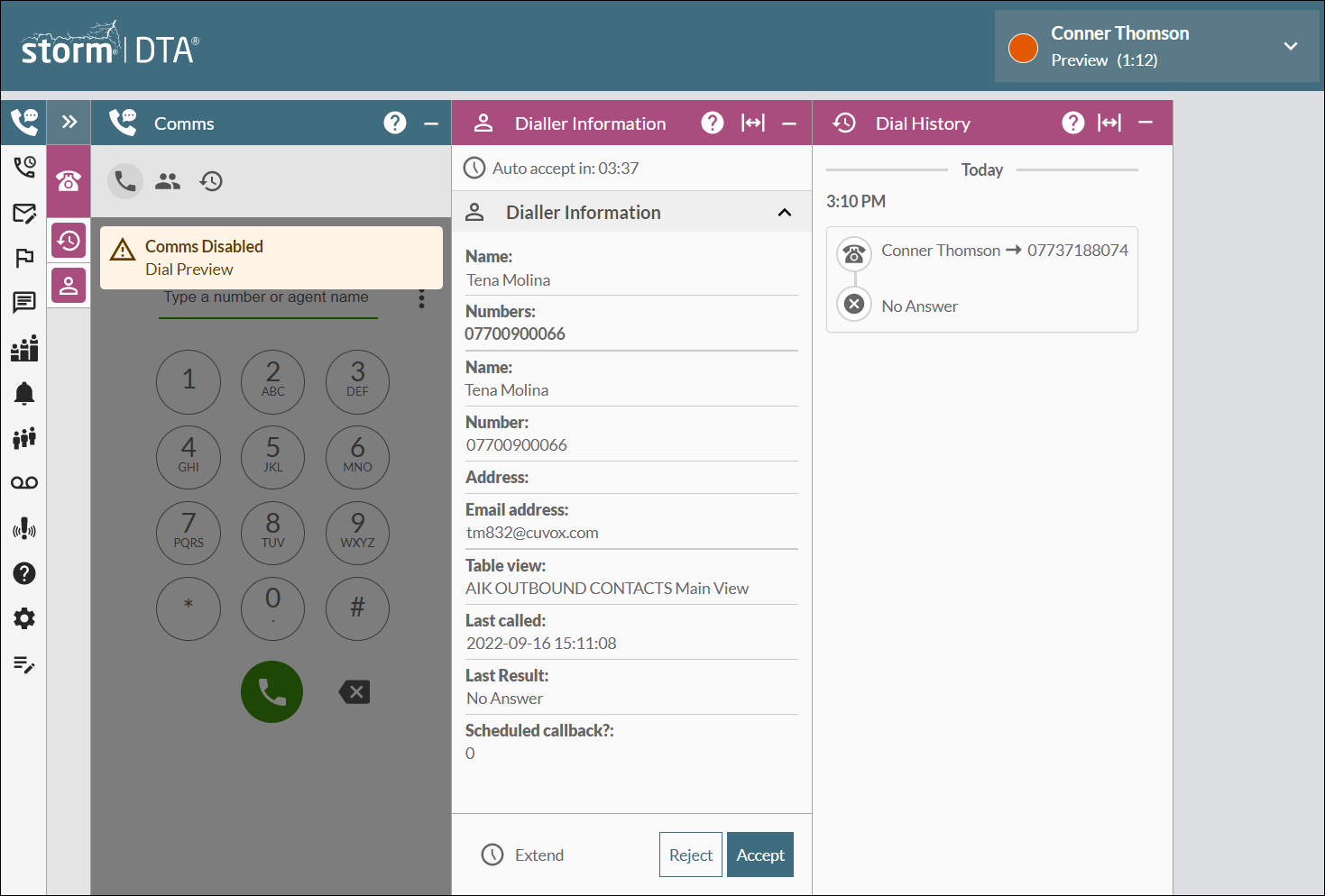 - On seeing your availability status change to 'Preview' and seeing the contact's name, number, and any additional information, click Accept or Reject on the Dialler Information Panel. If an Extend button is present, click it if you need more time to preview the details. If you don’t accept or reject, the campaign may be configured to automatically accept or reject the call on your behalf.