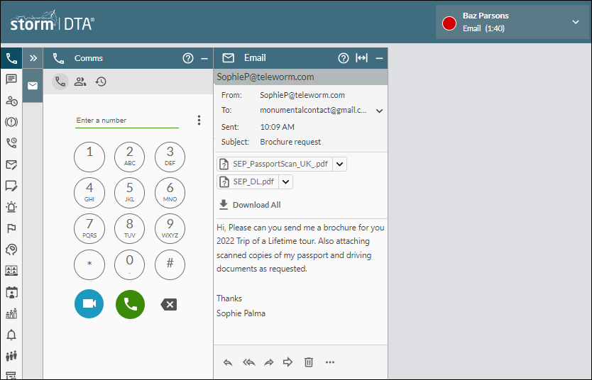 The Email Panel may display some additional information relating to the email, or you may be prompted to enter one or more items of data required by the email-routing service. See Email Information Panel. If the Web Launcher feature is enabled, a preconfigured web page may be launched on a separate browser tab when the message is routed to you.