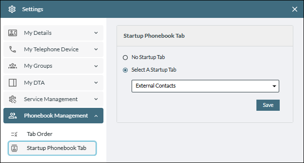 - Select the option 'Select A Startup Tab', and then choose the desired Phonebook tab from the drop-down list of available tabs.