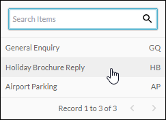 Displays a list, allowing you to select a predefined message template for insertion at the cursor point in the Reply message or Forward message field. You can also press the keyboard Ctrl + / keys to display the list. To quickly find a particular template in a long list, use the Search Items field to type any sequence of characters from its name (or its alias name as seen on the right-hand side). You may edit the template text after it has been inserted. |