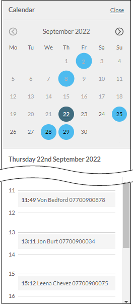 This tab allows you to see all of your scheduled callbacks in the OUTBOUND campaign. Scheduled callbacks are highlighted in light blue. Future callback dates are selectable. Selecting a date displays the callback times for that day in the list below. You cannot select callback dates that have passed. |