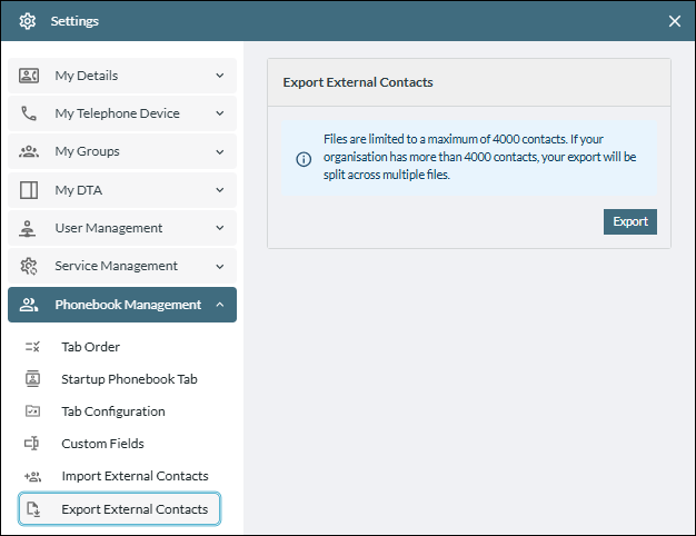 This section tells you how to export all of your organisation's external Phonebook contacts to a CSV file. Up to 4000 contacts can be exported per file. Contacts in excess of 4000 are exported to multiple files.