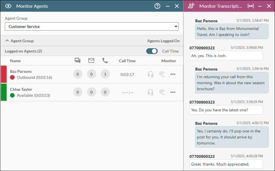 In the illustration above, the supervisor is watching the transcription of the call between agent Baz Parsons and their customer as it is being generated.