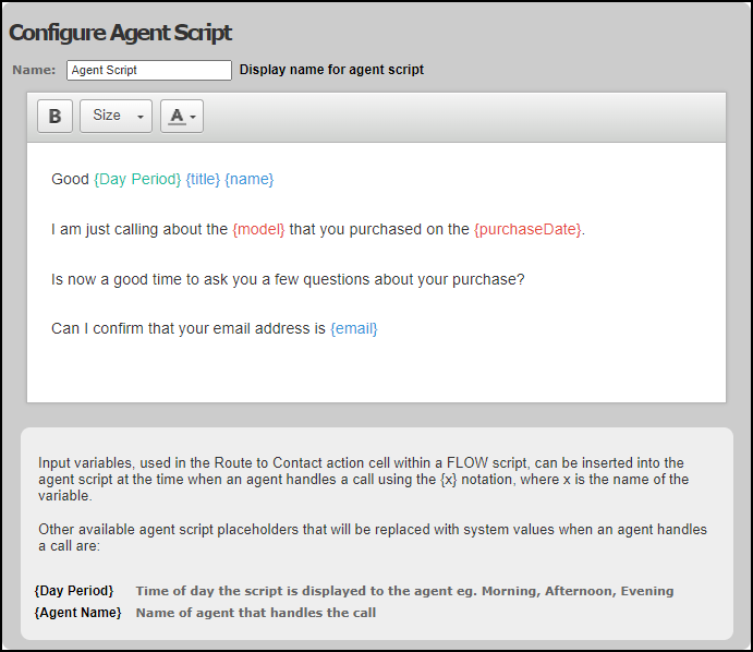 Note: in your agent script, you can include the {Day Period} and {Agent Name} variables, as well as variables used in a Route to Contact action cell in a FLOW script. Prefix the variable name with an underscore in both the agent script and in the FLOW Route to Contact action cell, to cause the variable to be displayed only in the agent script, and not in the DTA Web iPath contact panel. See the FLOW User Guide for details.