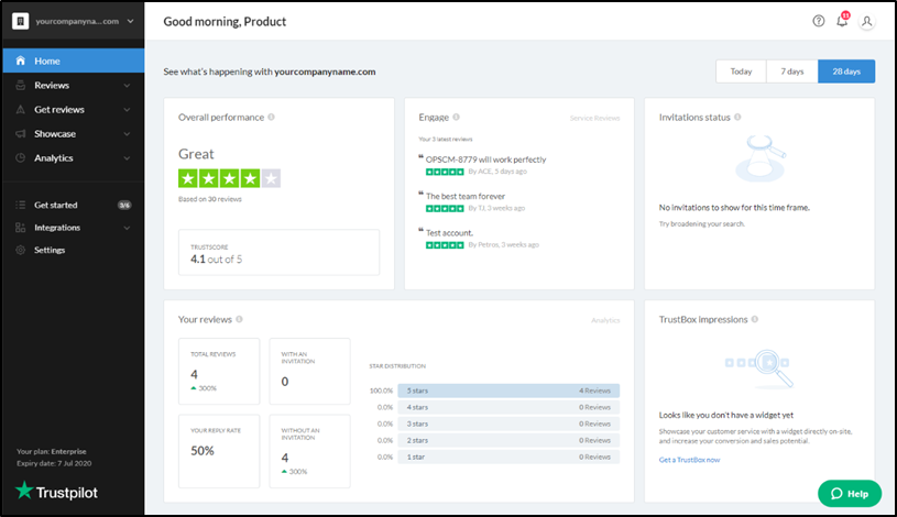 - Click Integrations on the Trustpilot dashboard to expand the options displayed.