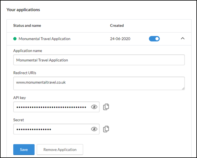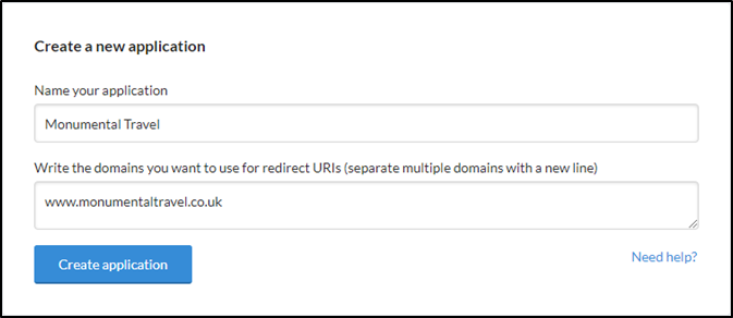 - Enter a name for your application, and then copy the domain name that you want to use from the ‘Service Portal Trustpilot Add Account’ form.