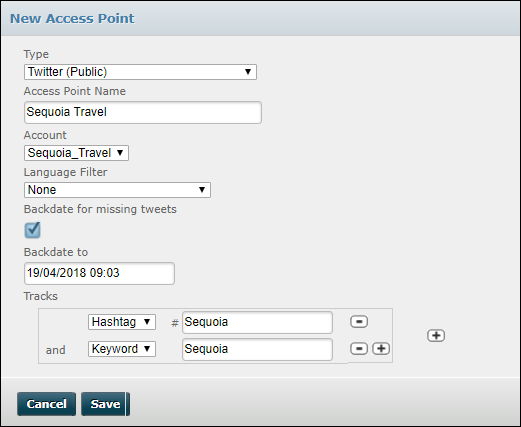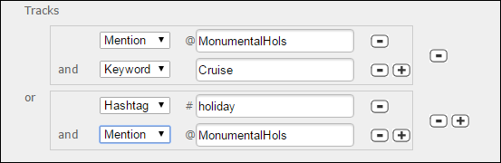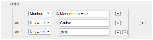For example, the following configuration finds Tweets that mention @MonumentalHols and includes both the keywords Cruise and 2016: