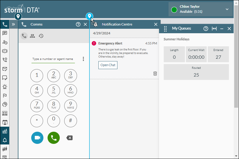 This feature allows a storm agent to quickly request support from a supervisor if they encounter problems in servicing a customer interaction. This is useful where an agent is encountering difficulties while servicing a customer interaction, or if they feel that their ability to service interactions is being adversely affected by stress or by feeling unwell.