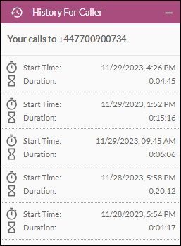 A History For Caller panel may be displayed showing the last five outgoing calls that were made to the caller from anyone in your organisation in the rolling 24-hour period.