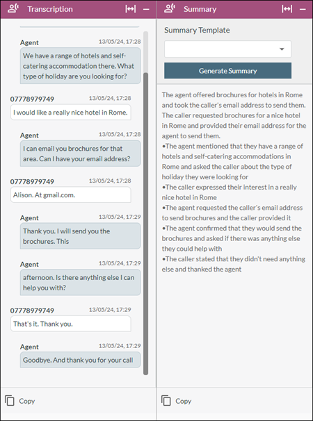 At the end of the call, you can click the Generate Summary button in the adjacent Summary panel to generate a summary of the conversation. The Copy button at the bottom of the Summary panel allows you to copy the summary for pasting into another application.