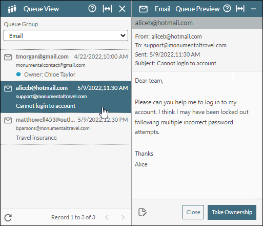 button at the bottom of the Email panel. Type your note and then click the Add Note button. The note is attached to the message as seen further up in the panel. You can add further notes using the Add New button as required. Click the Close button to close the sub-panel.Note: If you decide not to take ownership of the email (by clicking the Close button), any notes that you added to the email in the previous step will be visible to other agents when they open the email from the Queue View panel.