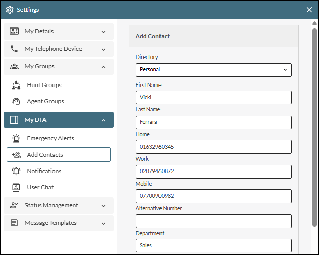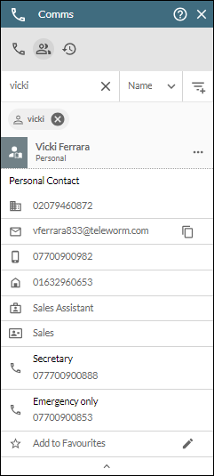 button.The contact now appears in your Comms Panel - Contacts Tab or Comms Panel - Phonebook Tab/Panel where they can be searched for like any other contact. Shown below is a user's personal contact as seen on the Contacts tab.