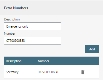 In the Directory field, select 'Personal' if you are creating a personal contact. Or, if you are allowed to create external contacts, select the name of the target external directory. Complete the remaining fields as required. Any values that you provide must match the field type. For example, an email address must be a valid one. See also, Valid Address Formats. If required, use the 'Extra Numbers' section at the bottom of the form to add further numbers for the contact. Entering a description, a number, and then clicking the Add button adds one extra number, which is listed below the fields. Repeat this for every extra number that you want to add.