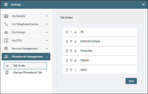 - In the Tab Order list, which reflects the left-to-right tab order in your Phonebook Tab/Panel, use a tab's