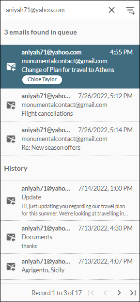 The panel updates to display matching items (if any). An agent name below a matching item indicates that the email is currently being handled by that agent.