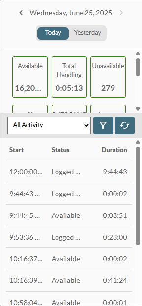 button on the Toolbar. This displays the Activity Log Panel showing your activity so far today. (If the button does not open this panel, then you do not have the user right to see activity logs.)Availability and interaction-handling metrics as configured by your storm administrator are displayed in the boxes near the top of the panel. Below this is a breakdown of the durations you have spent in different statuses during the course of today.