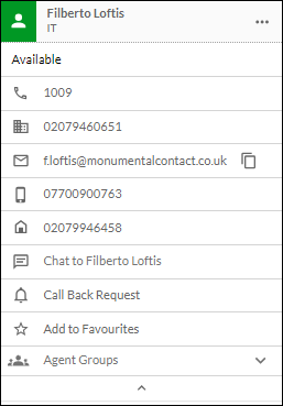 Displays your organisation's contacts. For storm users, their user group (typically, their department) and extension number are shown. For other contact types, appropriate information such as external contact number, or queue name is shown. Administrators who cannot log in to DTA are not displayed in the list. A contact's symbol and colour indicates the type of contact and their status, where relevant. Users