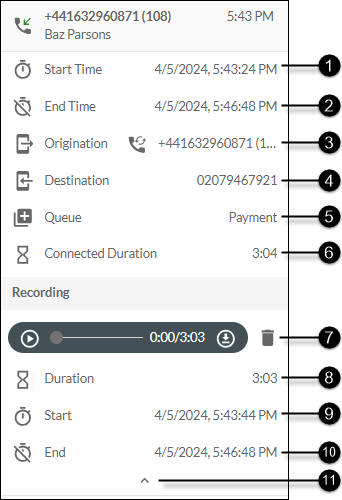 Note: these are not shown for a recording whose playback time has expired. A set of controls for playing the call recording through your speakers. Click the The |