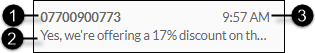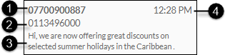 Clicking an incoming SMS message item in the history displays the following details about the message in a separate panel.