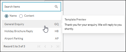 You can also press the keyboard Ctrl + / keys to display the list. To quickly find a particular template by name (or its alias name as shown on the right-hand side), select the 'Name' option and begin typing characters from the name in the Search Items field. To find a template by its content, select the 'Content' option instead. Hovering your mouse cursor over a template name displays a preview of its content. You may edit the template text after it has been inserted. |