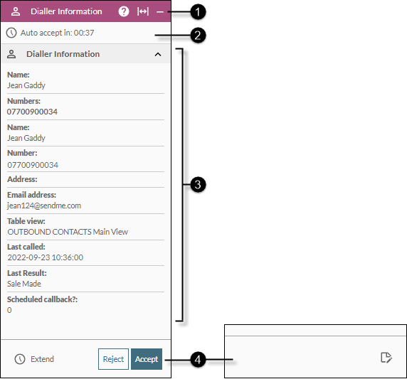 Displays information about the contact who has been routed to you. If multiple numbers are displayed for the contact, the number that is being dialled is displayed in bold. |