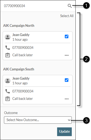 Searches the current OUTBOUND campaign for contacts matching the entered telephone number. |