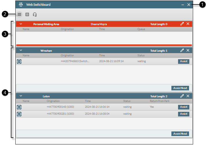 Each queue panel displays the entrants in that queue. The 'Return from Park' column is populated with a 'Yes' value if the entrant was previously parked in a call park and has now been rebounded to this queue as a result of their wait duration reaching the call park's timeout value. Assist. Click this button against an entrant to claim that entrant. Assist Next. Click this button to claim the queue’s longest waiting entrant automatically. Claimed entrants are moved to your personal waiting area from where they are routed to you immediately. |