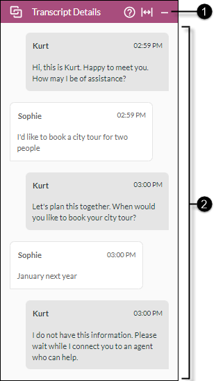 In some deployments, this panel is displayed automatically when a call is transferred to you from a chatbot. It provides a transcript of the conversation between the original party and a chatbot so that you can understand the context of the caller-to-chatbot interaction while engaging with the transferred caller. The panel closes automatically when the call ends.