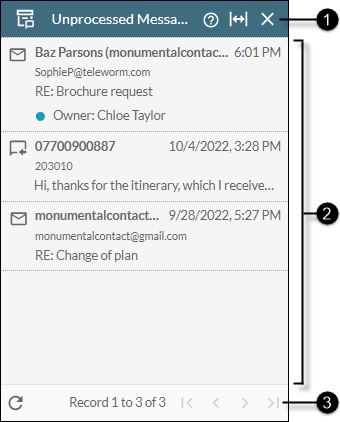 The list of unprocessed messages. Click a message to open a panel for handling the message (for example, in the Email - Unprocessed Panel or the SMS- Unprocessed Panel). A message that is tagged with an owner is one that was routed to that agent and then ignored by them. |