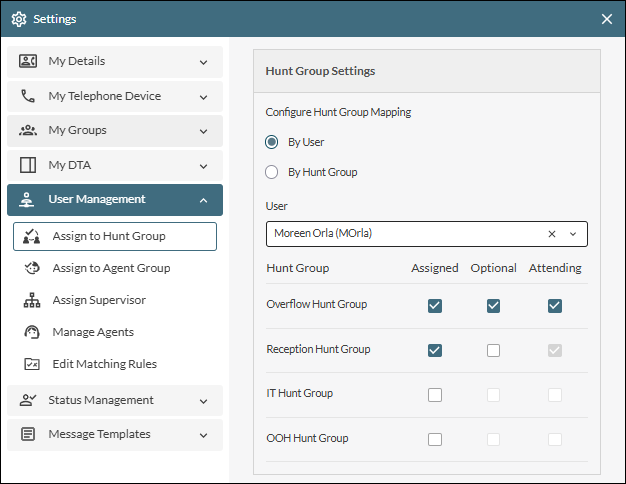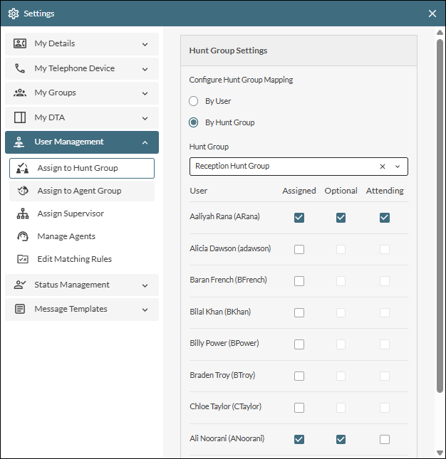 For an assigned user, select their check box in the Optional column if you want to allow them to opt in and out of the selected hunt group.