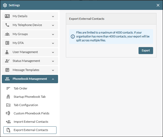 This section tells you how to export all of your organisation's external Phonebook contacts to a CSV file. Up to 4000 contacts can be exported per file. Contacts in excess of 4000 are exported to multiple files.