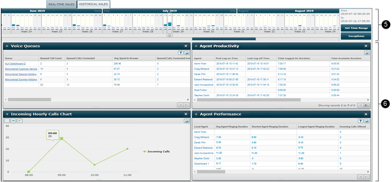 The real-time statistics and historical report dashboards that you have created or have been shared with you by other users. Clicking a tab displays the dashboard. Hovering over a tab name provides a description of the dashboard (if set):
